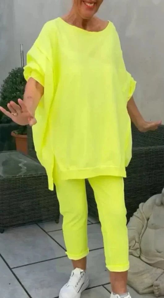 Step into breezy, flattering comfort with the Sabine Set, a lightweight two-piece made for real life. With its flowy top and relaxed-fit pants, this outfit skims gently over your midsection, giving you the confidence to move through your day without cling, squeeze, or fuss. Whether you’re running errands, catching up with friends, or simply relaxing at home, Sabine keeps you looking polished and feeling fresh.