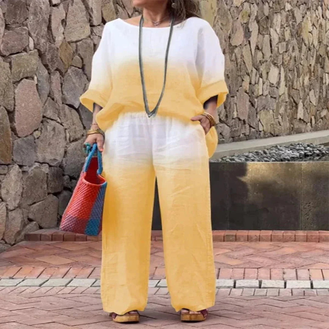 Step into airy ease with the Selena set - designed to flow with you through coffee runs, errands, or relaxed weekends away. The soft gradient tones bring a fresh, modern look, while the breezy fabric and relaxed fit offer gentle tummy coverage and a flattering silhouette that never clings. From quiet mornings to casual evenings, this two-piece brings breathable comfort and effortless polish to every moment.